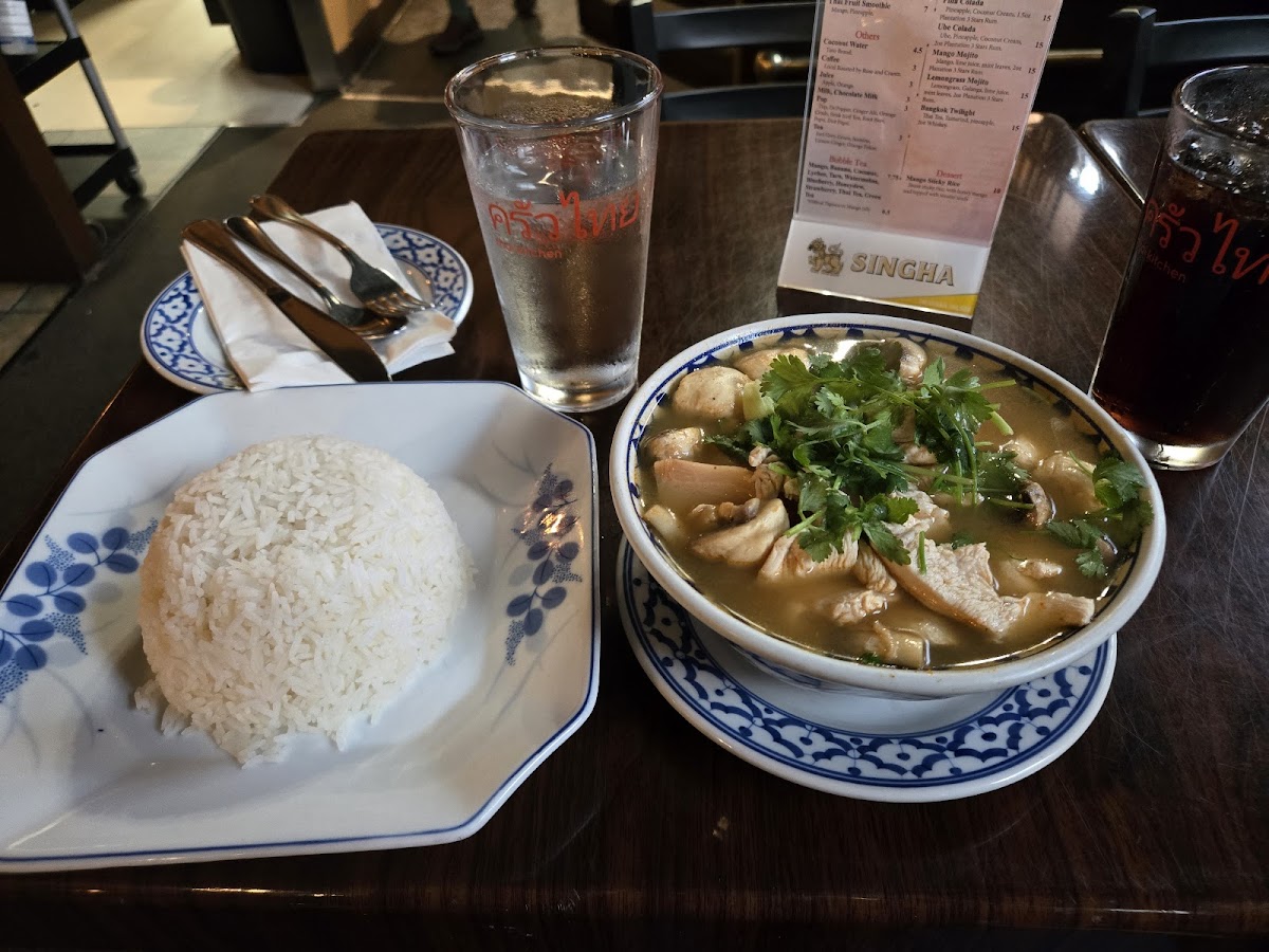 Tangy coconut broth soup with chicken, fresh mushrooms, chilies, lemongrass, lime leaf and galangal. Topped with fresh cilantro. +$3.00 with rice.